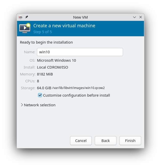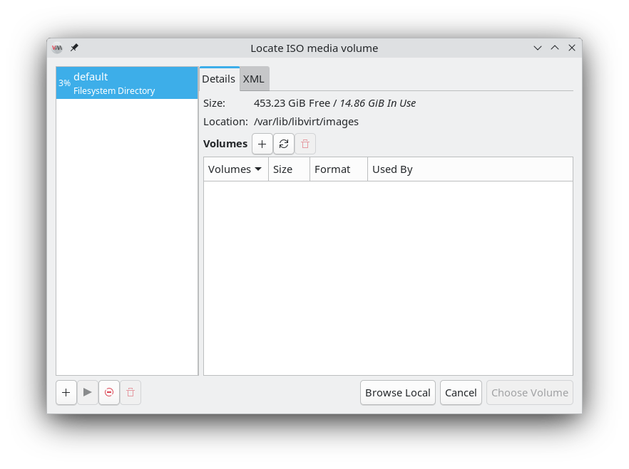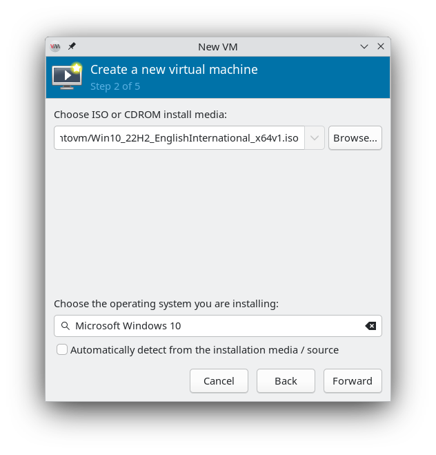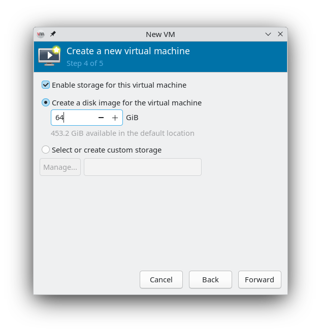 Next, launch virt-manager, which you installed earlier, and click the big button there to start the VM setup process.