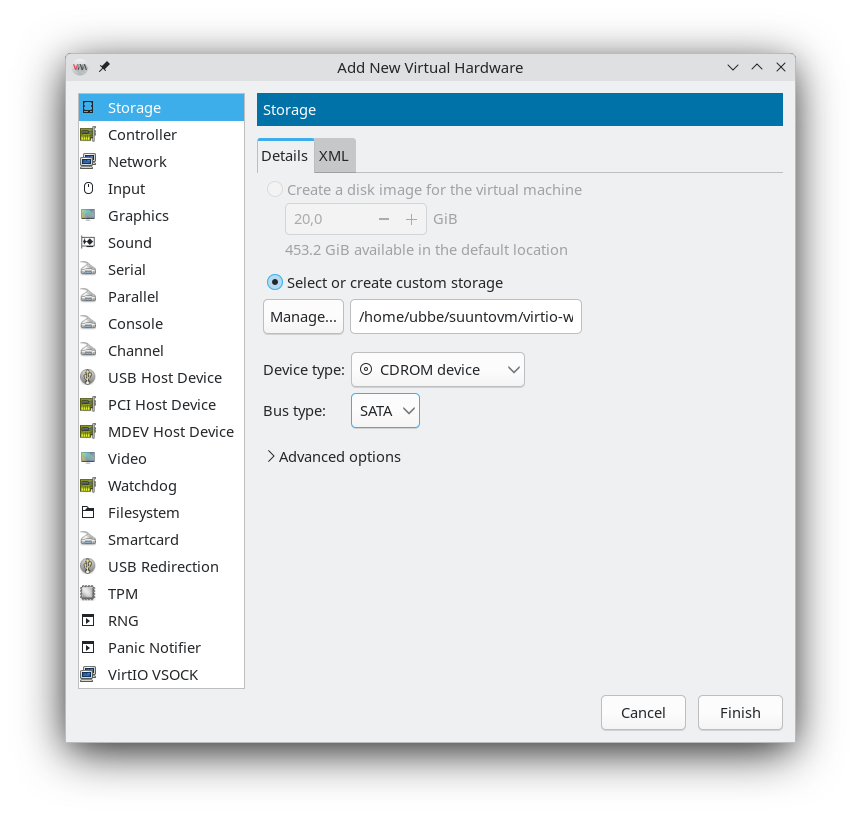 Now we’re going to add hardware 3 times. First add storage. Find the virtio.iso you downloaded earlier and select the type as CDROM device: