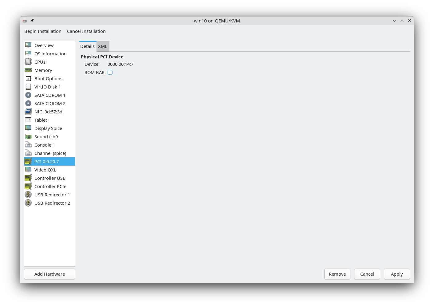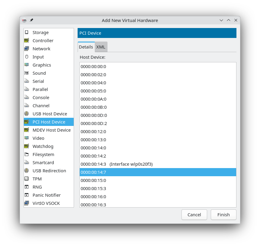 Then, add a PCI Host Device. You’re going to need that address you wrote down way back: