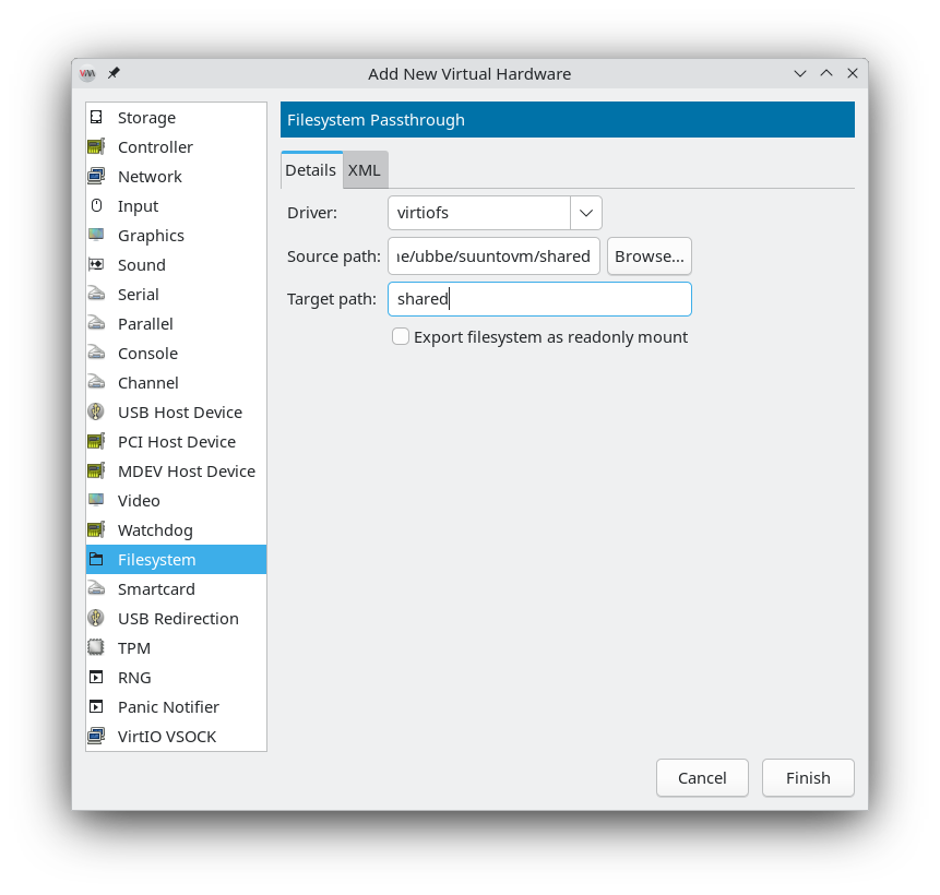 Finally, we want to add a shared folder aka ‘Filesystem’ so that you can send files between the host and the VM. Create a folder anywhere on your device and select it. Target path can be called anything: