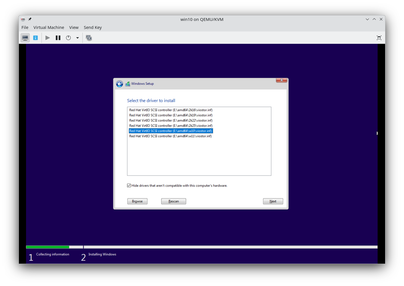 Now your main installation drive will appear. Windows will reboot on its own and then enter the second setup phase. Due to virtio we don’t have access to the internet, which is great! Windows will complain, just say you don’t have internet. It will reboot and complain again, but you must insist 🙂