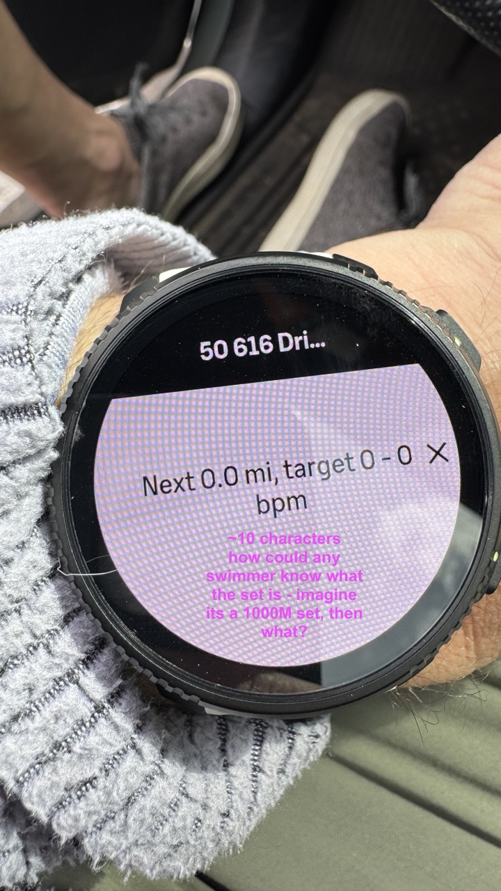 FWIW, Garmin really nailed the data screens for swimming. I respect that Suunto is otw to get there, but please, Suunto smart people, clue me into what I am missing. I’d love to find out I’m totally off base and the simple capabilities are there, I’m just the noob missing them: