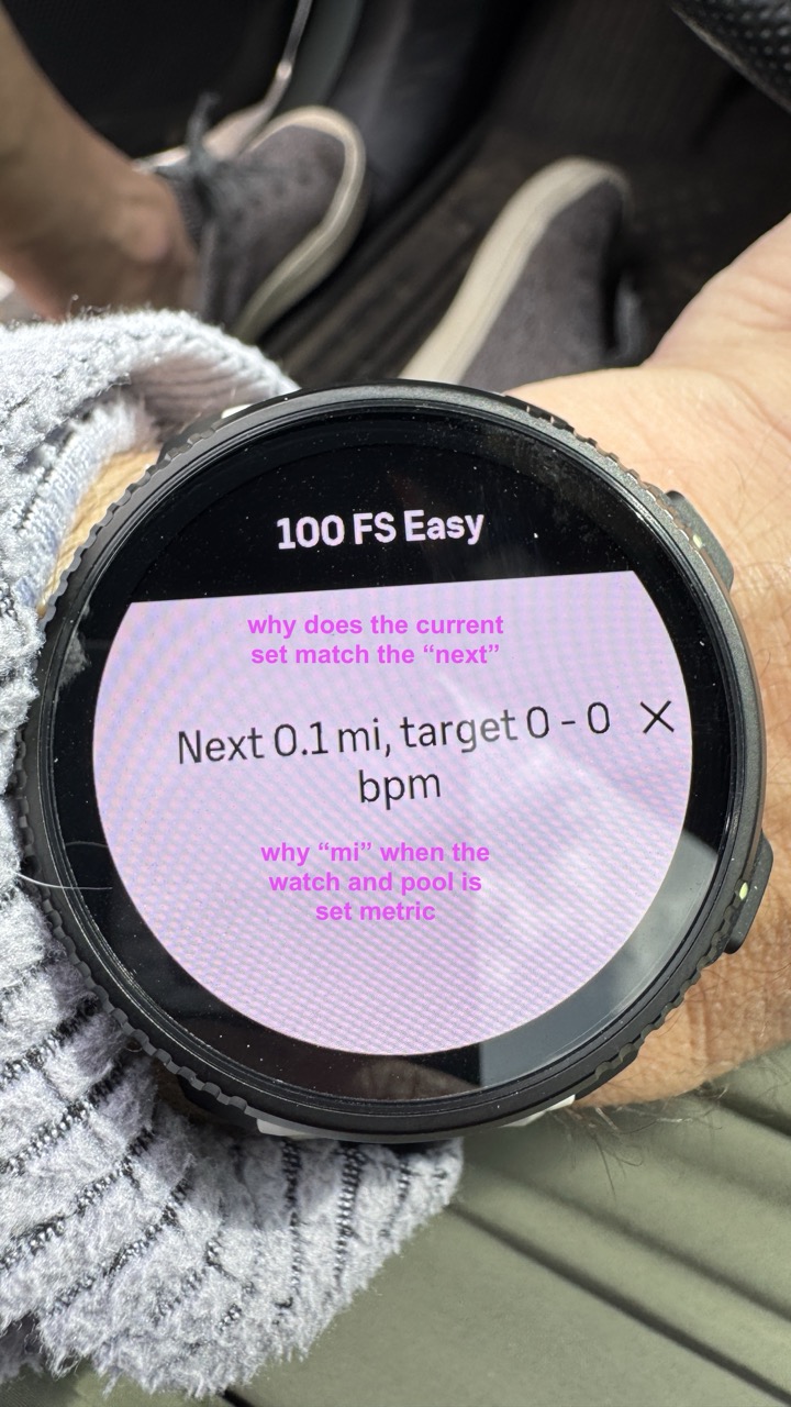 The repetition of the current segment on a set (e.g., 15 sec rest) is clear, but why is it duplicated in the ‘next’ detail, and why, when set to metric, does “.01 mile” appear? Suunto, does anyone swim in Finland, whats up here?