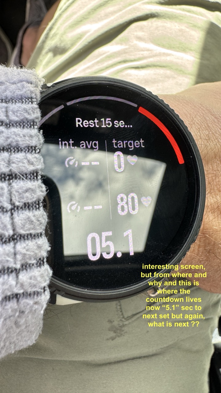 A structured workout ( especially in a pool) works when you know that during a rest, say 15, 20 seconds, you know what’s up next. So you can prepare for it. I was able to find a countdown to the next set, but the ‘what’ is a mystery (see pics 1-2)